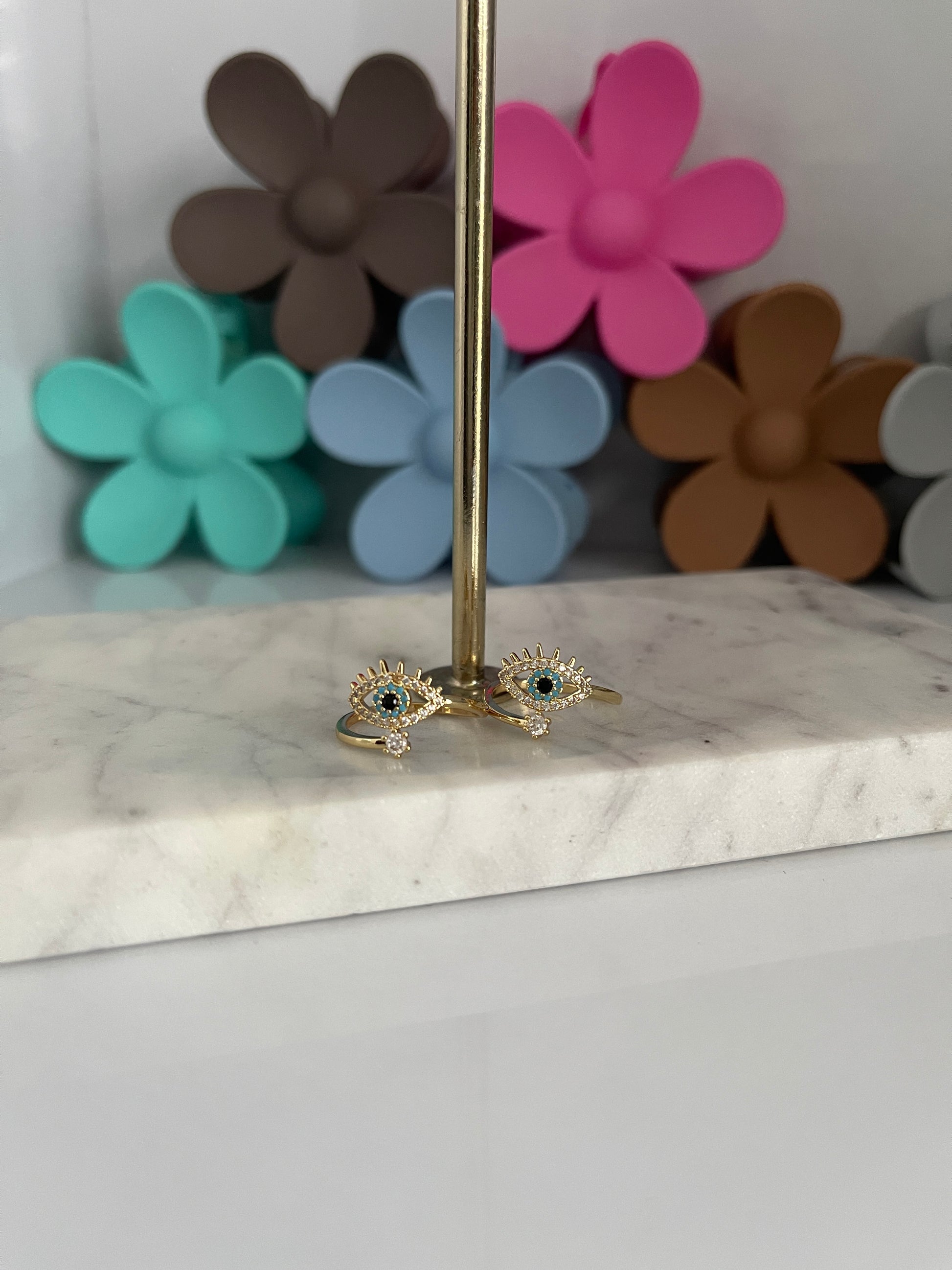 ¡BRILLA, con nuestra divertida Ojito Ring! Esta sortija ajustable de STAINLESS STEEL presenta un encantador diseño de ojo protector adornado con brillantes piedras en pavé. Perfecta para añadir un toque de magia y protección a cualquier atuendo. ¡Porque estar protegido nunca había sido tan estiloso y divertido!
